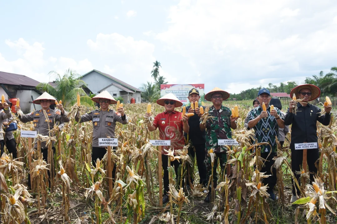 KUBU RAYA – Bupati Kubu Raya Sujiwo mengikuti panen raya jagung serentak kuartal II di Dusun Bunga, Desa Sungai Raya Dalam, Kecamatan Sungai Raya, Kamis (5/6/2025). Panen serentak dipimpin langsung Presiden Prabowo Subianto dari Desa Bange, Kecamatan Sanggau Ledo, Kabupaten Bengkayang, Kalimantan Barat.