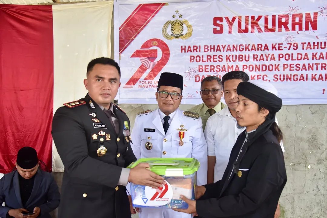 KUBU RAYA – Bupati Kubu Raya Sujiwo mengapresiasi Kapolres Kubu Raya dan jajaran yang telah menginisiasi kegiatan tali asih di berbagai lokasi di wilayah Kabupaten Kubu Raya. Pemberian tali asih dalam memperingati Hari Bhayangkara itu, kata Sujiwo, adalah bentuk kedekatan Polri dengan masyarakat termasuk kalangan pesantren. Sujiwo mengatakan hal itu saat menghadiri acara syukuran Hari Bhayangkara yang digelar Polres Kubu Raya Polda Kalimantan Barat di Pondok Pesantren Darul Iman, Kecamatan Sungai Kakap, Selasa (1/7/2025) siang.