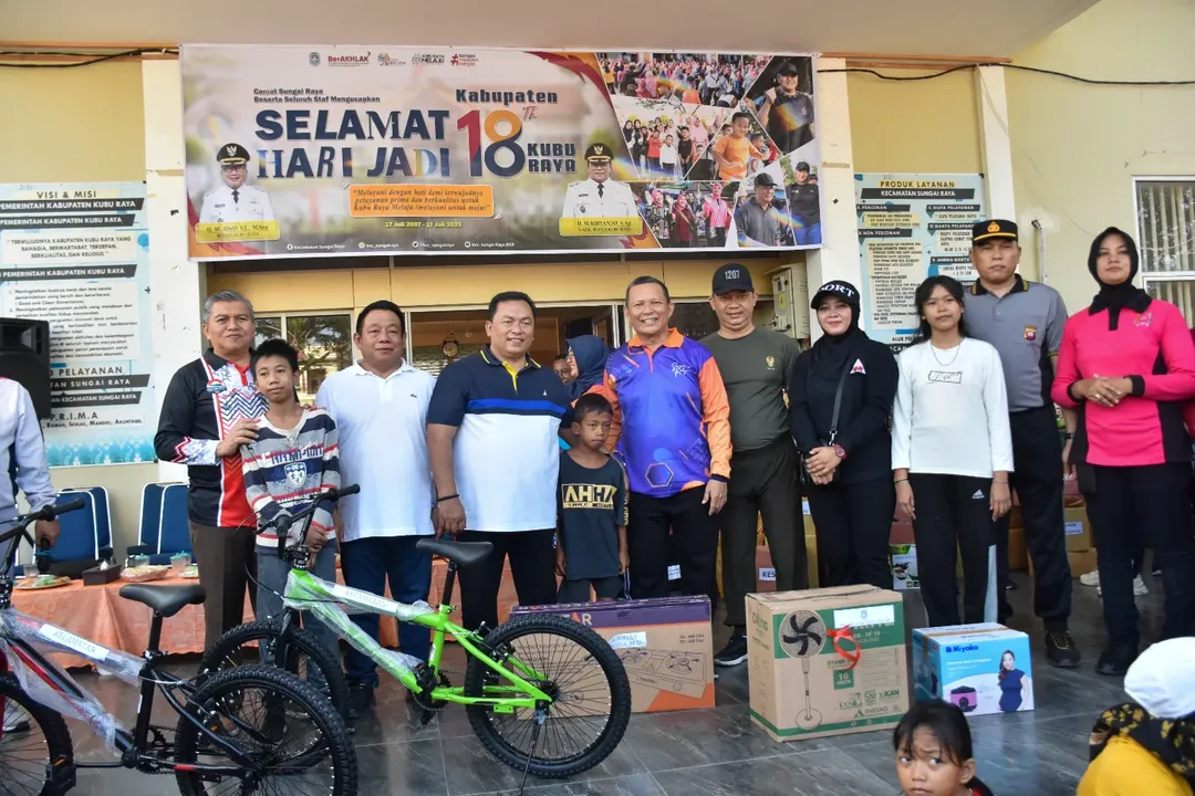 KUBU RAYA – Memperingati Hari Ulang Tahun (HUT) ke-18 Kabupaten Kubu Raya, Pemerintah Kecamatan Sungai Raya menggelar kegiatan jalan santai dan khitanan massal di halaman Kantor Camat Sungai Raya, Jumat (11/7/2025). Selain jalan santai, juga ada aksi peduli lingkungan berupa penanaman pohon di areal kantor camat. Acara berlangsung semarak dihadiri Wakil Bupati Kubu Raya Sukiryanto, Ketua DPRD Johan Saimima, Sekretaris Daerah Yusran Anizam, dan unsur Forkopimcam Sungai Raya.