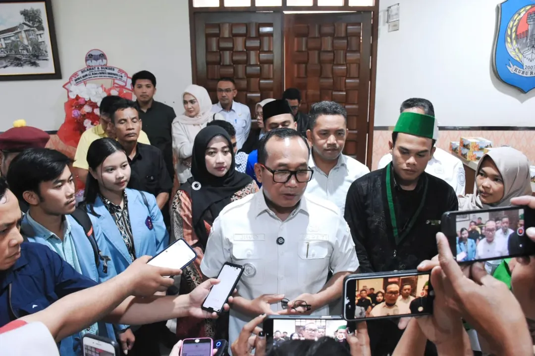 KUBU RAYA – Bupati Kubu Raya Sujiwo menerima kelompok mahasiswa Cipayung Plus dan sejumlah perwakilan Badan Eksekutif Mahasiswa (BEM) serta Perhimpunan Mahasiswa Kabupaten Kubu Raya (Primaraya) di ruang kerjanya, Rabu (3/9/2025). Pertemuan menjadi ruang dialog membahas isu gerakan penyampaian aspirasi mahasiswa secara nasional yang di sebagian tempat berujung kerusuhan. Cipayung Plus adalah gabungan tujuh organisasi kemahasiswaan yakni GMNΝΙ, ΗΜΙ, PMII, IMM, PMKRI, GMKI, dan KAMMI.